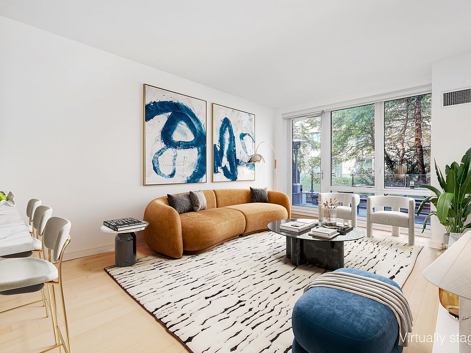 Bright One-Bedroom with Large Private Terrace at The Rushmore Bathed in natural light, this elegant one-bedroom home offers a 264-square-foot private terrace with beautiful eastern views of the landscaped garden. Inside, the residence showcases refined oak flooring and an open-concept kitchen outfitted with top-tier appliances from Sub-Zero, Viking, and Miele, complemented by marble countertops, a matching backsplash, and glossy lacquer cabinetry. The spa-inspired bathroom features travertine stone and crystallized glass finishes, a deep Kohler soaking tub, and Waterworks fixtures, creating a serene retreat. Storage is plentiful, with two custom-designed closets in the bedroom and an additional spacious closet in the hallway. Every window is equipped with motorized shades for modern comfort and privacy. The expansive terrace provides an ideal setting for outdoor dining, gardening, or relaxing with pets. Residents of The Rushmore enjoy a lifestyle of sophistication and convenience, surrounded by parks and waterfront promenades. Amenities include Luxury Attach Concierge services, a state-of-the-art Wellness Center with indoor swimming pool, onsite parking garage, private screening room, garden lounge, entertainment suite, billiards room, and sundeck.