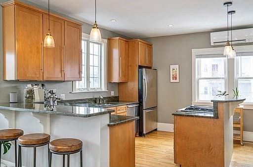Beautiful sunlit two-bedroom unit with high ceilings and gracious period details. Modern kitchen features open floor plan, granite counters, stainless steel appliances, and exposed brick. Updated tiled bath. Gleaming hardwood floors throughout. Laundry in unit. Insulated windows. Ductless mini-split A/C system. Smart thermostat and light switches. Amenities: Roslindale Village, Arnold Arboretum, Allandale Woods, Fallon Field, Healy Field. Public transit: Bus (24/35/36/37/51), Forest Hills Station, Commuter Rail (Roslindale Village).