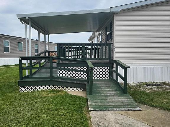 WOW!! What a great opportunity! This 3 bedroom 2 full bath home has been meticulously maintained by its original owner, and tastefully upgraded as well! As you approach the home you'll see the large deck with wheelchair ramp making this home easily accessible. Enjoy sitting on the front deck anytime rain or shine, you're covered by the large permanent metal roofed awning. As you enter the home you'll be greeted by an open floor plan with a large living room and dine in the kitchen. Cozy up by the custom Amish built gas fireplace, professionally installed from Byler's Stove Shop. The spacious master bedroom offers a walk in closet, on-suite bath with upgraded Jacuzzi walk-in shower. Two bedrooms on the other side of the home's split floor plan share a hallway bathroom, with new LVP flooring and carpeting throughout! Large shed, and all appliances convey AS-IS. There is a land lease of $550 per month and all potential buyers must be approved by community management prior to finalizing the purchase. Water, Sewer and Trash is included in the lot rent.