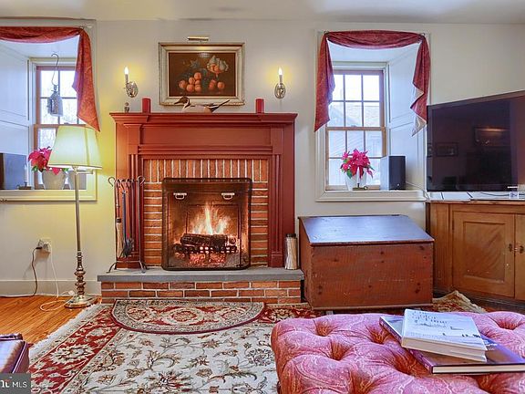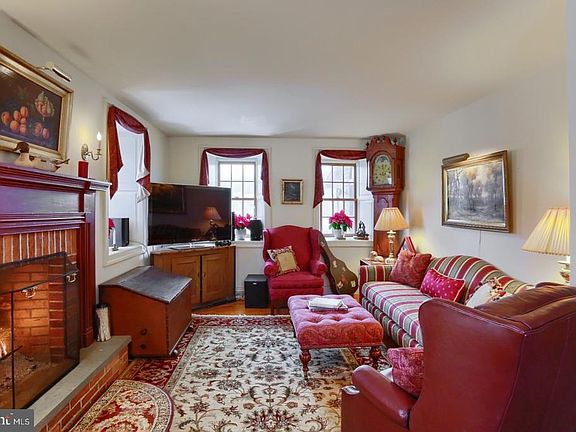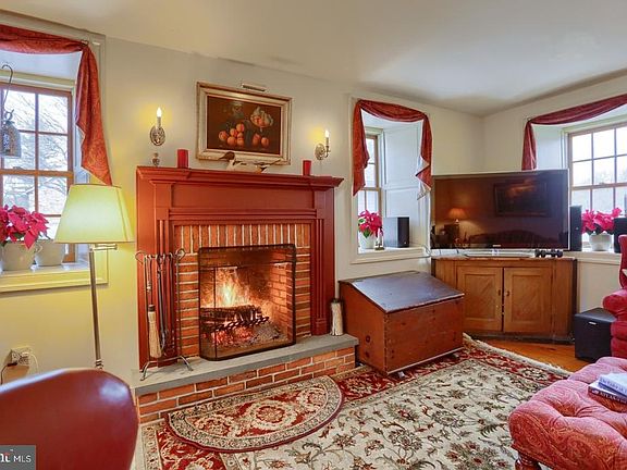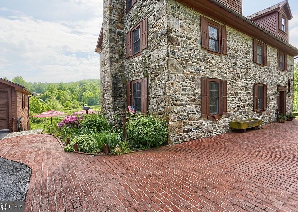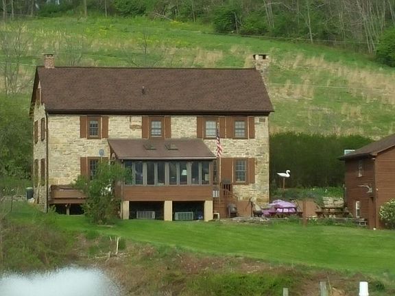 1846 mountain stone farmhouse with stone chimney and fireplace. Renovations circa 1990 with new plumbing and electric. New bathrooms (3) since 2014, deck with hot tub and stone patio. Stone smokehouse with walk in fireplace and antique clay tile roof. 3 car, 2 level detached garage/workshop. Separate workshop. 2 level 1846 stone bank barn renovated in 1999. 3 horse stalls, deluxe tack room, wash-stall with hot water, automatic waterers in stalls, room for more stalls, well lighted outdoor small dressage arena, pastures with board fence, one acre stocked pond, wood lot with campsite, 4 acre wild life area. Paved driveway. Heated sunroom, kitchen with updated appliances & corian countertops. Brick patio/driveway to front door.