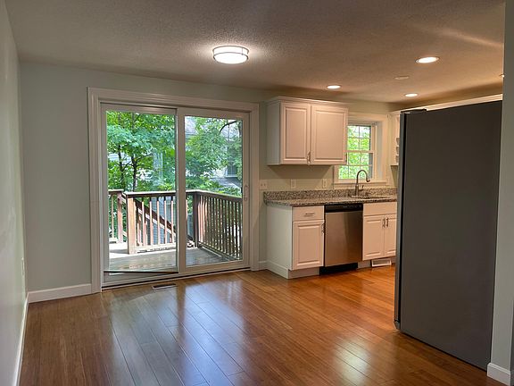 Newly renovated condo with beautiful hardwood floors, gas stove, quartz countertops, and stainless steel appliances. One attached garage space and one additional off street parking spot. Basement for added storage with washer and dryer in unit hookups. New windows and air conditioning/ heating unit. Outdoor deck with lots of trees. This unit is available immediately. Serious inquiries only.