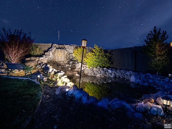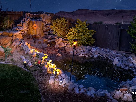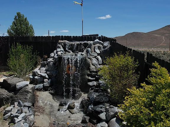 Bright, Open & Great Views! Welcome to your dream home, located on a serene cul-de-sac in the sought-after Copper Canyon neighborhood. This stunning property boasts a spacious 1/3 acre+ homesite, offering a large backyard with a custom waterfall and pond, a huge wrap-around patio, & breathtaking mountain views. Whether you envision a lush garden, a vibrant play area, or any outdoor paradise, this yard has the space to make it happen. With automatic sprinklers and drip systems in both the front & back yard, maintenance is a breeze. Great Room: As you enter, you'll be captivated by the bright and airy great room, featuring two custom French doors with inset blinds leading to the side and back patios. Cozy up by the electric fireplace and enjoy the seamless indoor-outdoor flow. Bedrooms & Bathrooms: The home includes three generously sized bedrooms and two well-appointed bathrooms. The primary suite is a private retreat, complete with a custom barn door to the ensuite bathroom and closet, and a sliding door to the patio. Kitchen: The heart of the home, the kitchen, is adorned with beautiful granite countertops, ample cabinet space, a large pantry, and modern appliances including a gas range, dishwasher, built-in microwave, refrigerator, and disposal. The open layout connects the kitchen to the great room, perfect for entertaining. Flooring: Light & bright flooring extends throughout the living area, kitchen, entry, and hallways. Two of the bedrooms are carpeted, while the third bedroom/workout area features durable vinyl tiles. Extras: A convenient laundry area with cabinets and shelves, and essential appliances such as the refrigerator, washer, dryer, and a water softener are all included. Patio & Backyard: The expansive patio is ideal for outdoor gatherings, offering stunning views and tranquility. Garage: The three-car garage is a hobbyist's dream, featuring epoxy-coated flooring, cabinets, a workbench, and an air conditioner. This home is perfect for those seeking a combination of comfort, style, and functionality in a peaceful, picturesque setting. Don't miss the opportunity to make this beautiful property your own! Contact us today to schedule a viewing.