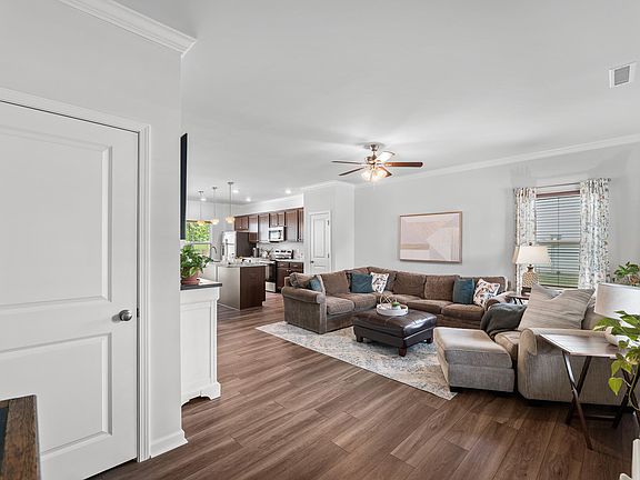 Welcome to Golden Ridge! This stunning 5-bedrooms, 3-bathroom home offers the perfect blend of comfort, privacy, and thoughtful upgrades. Step inside to discover a main-level guest suite and a beautifully upgraded kitchen featuring granite countertops, a 10-foot island, custom flat panel cabinets, and GE stainless steel appliances. Enjoy premium touches throughout including crown molding, upgraded LVP flooring, and premium wood-look blinds. The second floor features a vaulted primary bedroom with a walk-in closet and ensuite bath offering a garden tub, separate tiled shower, and a double vanity topped with quartz. An open loft/bonus room upstairs is perfect for a playroom or media room. Step outside to enjoy the screened-in patio, cozy fire pit, and spacious 208' deep homesite.