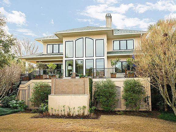 Beautifully sited on a tranquil lagoon, the immaculately maintained home at 80 Surfsong Road offers the best of both worlds: expansive pond views to the rear and the rhythmic surf of the Atlantic Ocean just across the lane. It also offers a delightful daily choice: take a dip in the salty water of the sea or in the home's heated saltwater pool with ozone and saltwater purification systems. The pool's inviting waters are set into a rear sundeck overlooking the lagoon and the property's venerable live oaks. Renovated to the studs in 2008 by Steve Brenner with Solaris Builders, this home is a true work of art. On approach to the home, brick pathways and a grand Charlestonian staircase with wrought-iron inset welcome guests to ascend to the covered front porch. There, striking entry doors with leaded glass, works of art in themselves, lead into a high-ceilinged foyer. Visible from the moment of entry is the living room's two-story wall of windows, filling the home with sunlight and showcasing the water views. Custom shelving flanks a dramatic gas fireplace, the hardwood flooring is cool underfoot, and an open gallery with striking iron balustrade overlooks the space from the second floor. A television rises from a cabinet upon command. A wide arched doorway cased in lovely white trim frames a light-filled dining room with a glass door leading to the wraparound porch. It's open to the home's white kitchen with sleek white cabinetry, contrasting countertops, and breakfast bar offering extra seating space. Here the flooring is a beautiful pale marble. Tall windows over the sink invite natural light inside, and the appliances are professional grade, including the Wolf® six-burner gas cooktop, stainless-steel dual wall ovens, Miele® dishwasher, and paneled Sub-Zero® refrigerator. A butler's pantry offers both a wine cooler and extra prep and storage space. On the opposite side of the main floor lies the home's first master suite, with a row of windows overlooking the pond and a master bath with custom-designed marble flooring, clawfoot tub, expansive frameless-glass walk-in shower, and his-and-hers sinks. Take the staircase or the home's elevator upstairs to the striking wood-paneled study with floor-to-ceiling library bookshelves. One wall is given over to a wide opening overlooking the view via the living room windows, and can be closed for privacy with pocket doors. The home's second-floor master suite takes up the west wing. Windows frame an even more dramatic view of the pond, and the bath offers a soaking tub set beneath sunny windows. Wool sisal rugs cushion the hardwood floors in all three bedrooms on this level, and the two guest bedrooms share a full bath. Additional features of this spacious, open home include a Japanese- and Balinese-inspired garden designed by Howell Beach including Balinese statues, Chinese horse troughs, and bonsai trees; exotic trees including Jacaranda, Ceibo, and Palo Borracho; exotic flowers including Sasanqua and Japonica camellias; an Art Deco theme including several Japanese screens; a climate-controlled two-car garage; a climate-controlled mudroom and storage with built-in shelving on the ground level; an attic with additional storage; state-of-the-art internet and wi-fi capability; a built-in TV; impact-rated windows and doors; irrigation, sound, and security systems; numerous ground drains facilitating excellent water runoff; split HVACs; and outdoor lighting across the entire property. A Kiawah Island Club Social Membership is available with the purchase of this property.