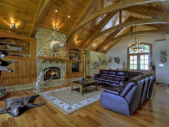 Spectacular Deeded Dock, Prominently located lakefront on Lake Blue Ridge. 2 lots =.85 acres. House placed overlooking the entire lake. Close to Blue Ridge,GA..Huge home with arched wood ceilings and 3 stacked handplaced stonework fireplaces, hardwood Natural light, custom cabinetsGranite Kitchen Countertopes & bathroom countertop. Smart Home lighting and security syste, private gym and theater room, Giant family room with built in Glass Aqaurium, 2nd kitchen in the lower level if you need to care for someone in your family to have seperate living area of one side of the lower level. over 7000 sq feet of home, upper 3 & lower 2 car garage.Bedroom over garage with stairs to storageroom.