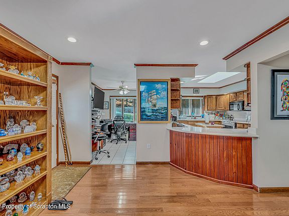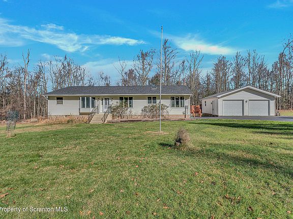 Discover the charm of this spacious 3-bedroom, 2-bath ranch home nestled on 5 scenic acres! This inviting home offers an open and airy layout and hardwood floors. The primary suite features a bathroom with a jacuzzi tub and a separate shower, creating a relaxing retreat. Home includes a finished lower level with a cozy family room warmed by a pellet stove, perfect for gatherings or quiet evenings. Outside, you'll find an upper deck with stunning views of the property, ideal for entertaining or enjoying the peaceful surroundings. A 2-car detached garage completes the package, providing plenty of space for storage or hobbies. This is the perfect blend of comfort, privacy, and natural beauty - come see it for yourself!