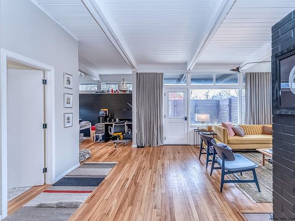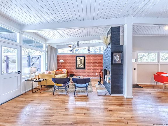 Set at the top of one of the most Prestigious street in the City of "Kingston" you will find this Sleek and Sophisticated Mid Century Comtempo... Don't miss out on this beauty that has been completely updated.. Top to bottom you'll find light and bight even on those gloomy days. Vaulted ceilings, exposed brick, nice hardwood floors, local bluestone and sooo much more. Brick fireplace ready for those chilly nights. One of the bedrooms is now an office or could be a den and open to the living room. Step out the door in the kitchen to find a fun deck area that has trek decking. As you step through the living room you will find an amazing outdoor living space.. Totally private and with a spectacular bluestone patio.. Oversized yard and so much more..The brown over head light in the bedroom doesn't stay... Kitchen is light and bright, butcher block countertops, end end appliances too. Office could be used as den.
