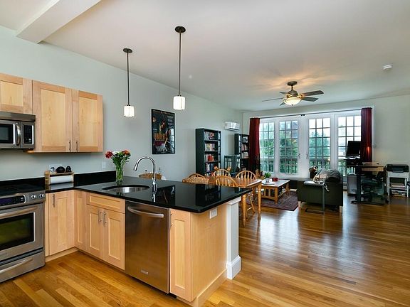Very nice, modern Loft-style 1 BR condo with 10' ceilings and lots of natural light at Union Place. Open plan living room, dining area, kitchen with granite counter top, breakfast bar, stainless steel appliances, shaker style maple wood cabinets with lots of storage. Oak hardwood floors throughout, in unit laundry hook ups but you also ave free laundry across the hall, bedroom with walk-in closet. Private locked storage room in basement, Bike storage room with 1 hook for your bike. Elevator building, shared roof deck with firework views and courtyard BBQ area. Walking distance to Union and Inman Square and CT-2 Bust Stop in from to MIT/Kendall/Red Line. Garage parking available for $152. Car owners must rent garage space per condo docs and city of Somerville. No car? No Problem. Prospective tenant to pay full fee to be split with cooperating broker.