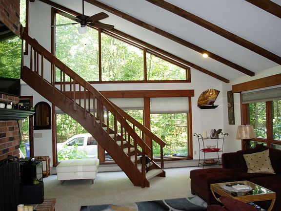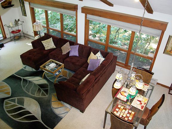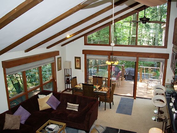 Bright and light home with open floor plan, extensive stone patio, decking, screened porch, hot tub. Bedroom, full bath, and office / den on first floor. Great room with vaulted ceiling, floor to ceiling brick fireplace, curved staircase to second floor with two additional bedrooms and full bath. A great value!