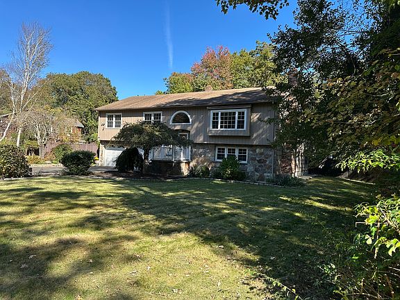 Welcome home to this stunning turnkey residence where comfort meets modern style. Set back from the street on a beautifully landscaped lot, this bright and spacious home offers sun-filled open spaces and thoughtful design. The living room features cathedral ceilings with charming wood beams, a dramatic picture window, skylights, and hardwood floors. The brand-new kitchen is a showpiece with granite countertops, an oversized island, tile flooring, abundant cabinetry, and a beautiful cut-out overlooking the living area. Natural light pours through an impressive window above the front door and into the sunny four-season sunroom with French doors leading to the deck. The main bedroom suite includes a full bath with shower and walk-in closet. The renovated main bath shines, with two additional bedrooms upstairs and a fourth on the lower level. The fully finished basement offers a half bath, convenient laundry and French doors to a patio and inground pool. Outside, enjoy a private fenced yard, oversized shed, level lawn, and two-car garage with ample parking. Additional features include pull-down attic storage, central air, and a heated basement. Move-in ready and designed for modern living, this home is the perfect blend of elegance, comfort, and functionality.
