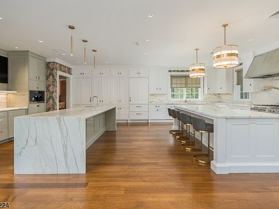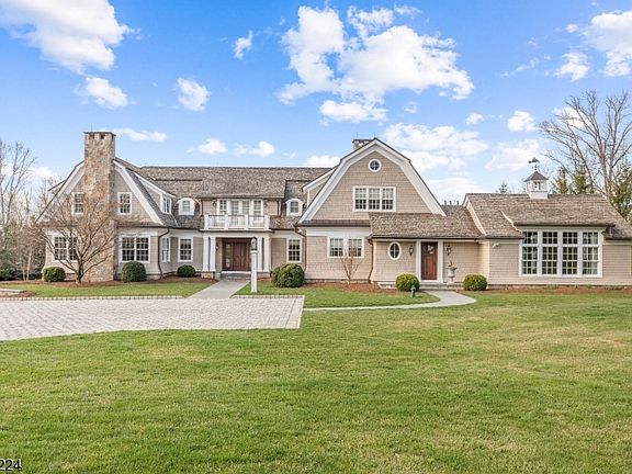 Timeless Elegance Meets Modern Luxury in New Vernon This modern and beautifully detailed home offers a fresh take on classic architecture, featuring on-trend design details and exquisite craftsmanship. Built-in 2008 and updated in 2024, this Shingle-style estate exudes understated elegance and sophistication like coastal estates in the Hamptons and Newport. Privately set on 3.42 acres with a gated entry and professionally landscaped grounds, the exceptional property is accented with gas lanterns, expansive bluestone terraces, meandering stone walls, Belgium block curbing and parking courts, and beautiful mature plantings. The 8,500+ square-foot layout has been renovated with 2024 updates including stunning Christopher Peacock kitchen and baths. With four/five bedrooms, five full baths, two powder rooms, and a four-car heated garage, this home is perfect for formal entertaining or casual gatherings. Bespoke details such as deeply layered crown moldings, wainscoting, quarter-sawn five-inch plank white oak floors, radiant heated stone, marble, brick and bluestone floors, freshly painted interior and exterior, soaring ceilings, lustrous mahogany paneling and three fireplaces are among the notable design elements. Expansive window walls frame the pastoral outdoor setting of green lawns, bluestone terraces, and stunning natural views of the surrounding woodlands. Introduced by a wide entrance foyer, long galleries capped by tray ceilings extend into the home’s right and left wings. Straight ahead, the dining room’s artfully carved columns and convenient butler’s pantry set the stage for special gatherings. Continuing into the left wing is a wine room designed with a mahogany paneled, temperature-controlled chamber and wet bar. Mahogany paneling continues in the ventilated smoking lounge with an adjacent climate-controlled humidor. Continuing the easy flow is the living room with elegant millwork and walls of windows and the fireside library featuring a mahogany coffered ceiling, dimensional wall panels, and built-in custom cabinetry. In the right wing, unparalleled amenities converge with a high degree of functionality in the ultimate Christopher Peacock kitchen, expertly renovated in 2023. This noteworthy designer’s handcrafted custom cabinetry with walnut interiors is complemented by dual center islands, marble surfaces, commercial-grade appliances, and a curved window-walled dining area. The dining area adjoins a great room, where the fabulous stone fireplace ascends to the top of an ornately coffered two-story ceiling, and French doors reveal the bluestone terrace. An adjacent den, wrapped in high beadboard wainscoting and enhanced by built-in media, welcomes relaxed nights at home. This wing also contains a handsome billiard room tucked under a dramatic vaulted Cypress paneled ceiling, while radiant-heated brick floors arranged in a herringbone pattern and a custom wet bar enhance the convivial atmosphere. Multiple sets of French doors on the main level open to an entertainment-friendly bluestone terrace, a high-end outdoor kitchen, and the detached, office/media center. This spectacular space has a stone fireplace rising to the high-peaked mahogany ceiling, while three retracting glass walls and climate control features make this inviting area a delight in every season. Upstairs, a long window-walled gallery hall reveals the private balcony overlooking perennial gardens and the parking court. A beautifully designed primary suite sited in its own wing provides amazing storage options in the bedroom, a dressing room fitted with custom cabinetry, and a chic room-sized walk-in closet featuring custom wardrobe organizers and an island. Luxurious designer appointments prevail in the sizable marble-clad primary bath, elegantly renovated in 2023 with Christopher Peacock vanities and cabinetry. There are three additional bedrooms on this level, all with spa-like ensuite baths. Two of the baths were completely updated in 2024 with Christopher Peacock cabinetry and stunning custom-designed marble flooring, shower interiors, and vanity countertops. Echoing the refined sophistication of the upper levels, a spacious walkout lower level has a fully mirrored exercise room with a heated rubber workout floor, a recreation room /optional 5th bedroom clad in beadboard wainscoting, a full bath with an oversized marble shower, Travertine-floored mud room and ample closet space. Several utility rooms store a variety of innovative technology features, including the Control 4 system serving the home. This level also encompasses a huge four-car garage with radiant heated bluestone flooring, mahogany beadboard walls, and columns, a suede-finished paneled ceiling, and a custom mahogany garage door. Known for its refined estate properties and winding country roads, the sought-after New Vernon section of Harding Township is centrally located in Morris County. It is about 40 miles west of Manhattan, 30 miles from Newark Liberty International Airport, and close to NJ Transit Midtown Direct train stations in neighboring Morristown and Madison. A local network of interstate highways includes Routes 202 and Interstates 287 and 78. Highly rated public and private schools, world-class golf courses, fine dining, and upscale shops define this picturesque part of the state.