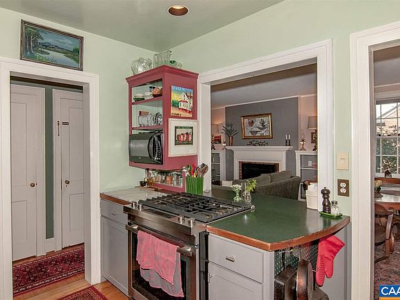 New listing in North Downtown, Brick cape 1938 vintage, oh so charming, rock walls, wood burning fireplace, sun porch with built in book cases, large front covered porch, extensive and unusual gardens, hardwood and pine floors, 4 BR, 2 Full Baths, lots of wonderful shade trees. Heat pump 2016 and warm gas hot water heat as well with programmable thermostat. Extensive built in storage in the upper level bedrooms as well as eave storage. Private back yard with paths and patio area to enjoy out door dining. Funky, fun, fence is just one more charming feature of this well loved home within walking distance to all the downtown C-ville has to offer. Well designed kitchen with opening into the great room so you can cook and be part of the party!