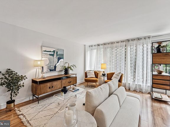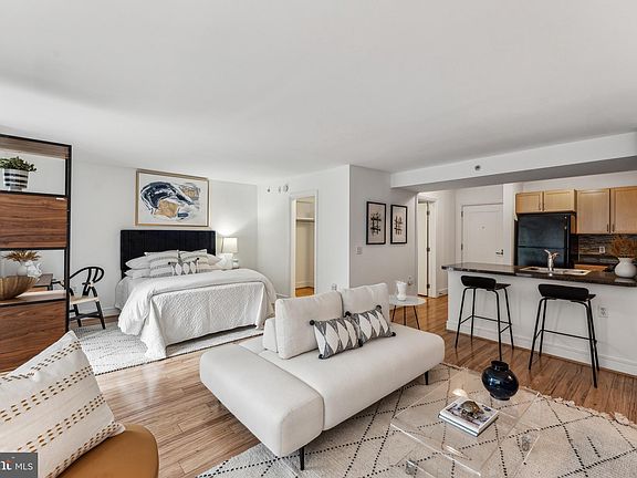 This chic studio at the Potomac Place Towers enjoys plentiful sunlight and tree-top views. The spacious unit features wide-plank flooring throughout, a kitchen with bar seating and gas cooking, and a private balcony. The reasonable condo fee ($604/month) pays for all utilities. Building amenities include an outdoor pool, a community room with a wet bar, a fitness center, and a staffed front desk. New A/C!