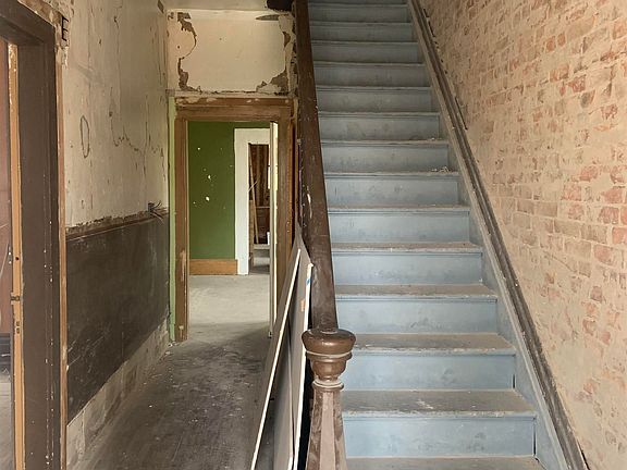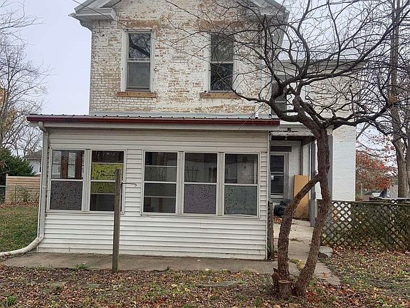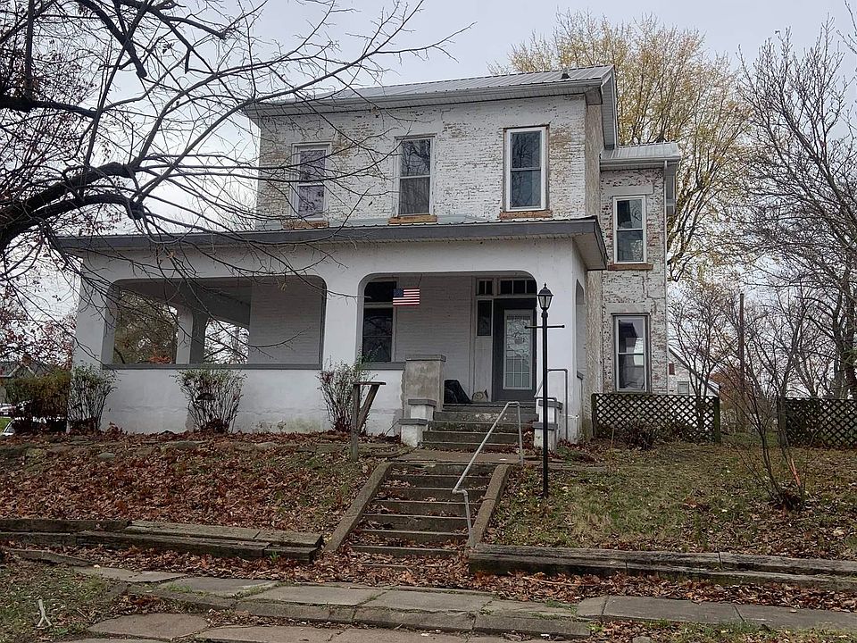 HANDY PERSON SPECIAL! This grand old house needs love as it is about halfway through the renovation process. Much of the electrical system has been professionally redone. Several walls and ceilings have been professionally dry-walled and are ready for painting. The plumbing and heating systems have been completely removed and need to be replaced. The kitchen and bathrooms are unfinished. Stainless steel kitchen appliances are included, but are not currently on site. This brick home sits on an extra wide corner lot with a mostly fenced yard and mature landscaping. It has a welcoming wrap around front porch, spacious rooms, an enclosed back patio, and a detached one-car garage with a workroom. The main floor has a living room, family room, dining room, kitchen, and a half bath. The upper level has a laundry room, three large bedrooms, and two bathrooms with one being an en suite to the primary bedroom. The hardwood floors are in good shape and the foundation is solid. A metal roof in good repair sits atop this home and a clean cellar provides storage space and convenient access for the mechanical systems. This house is being sold as is where is.