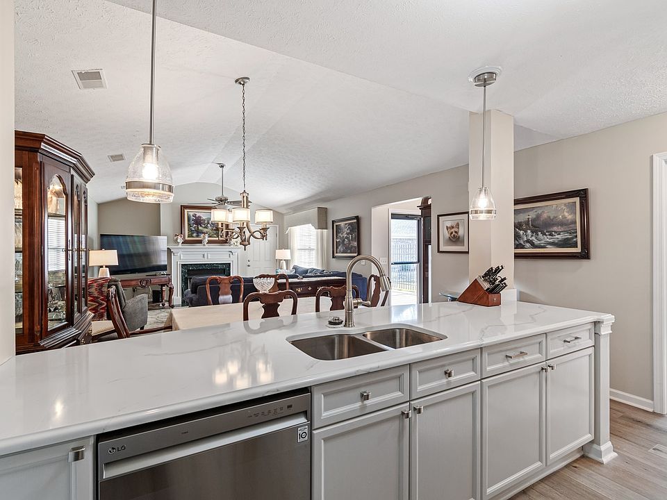 One level living at its finest! Renovated with a stunning kitchen, open floor plan, new floors. Meticulously maintained, this one is a must see! Gated sun-filled courtyard with large green space and trees next to it. High ceiling living area with fireplace. Spacious two car garage. Ample closet space. Light hardwood throughout. Stainless appliances. Beautiful kitchen renovation with large countertops and cooking space. Nice, bright white lighting and natural light fill the rooms. Updated bathroom cabinets. Large tub in primary bath with separate walk in shower. Great unit location at back of complex and an end unit.