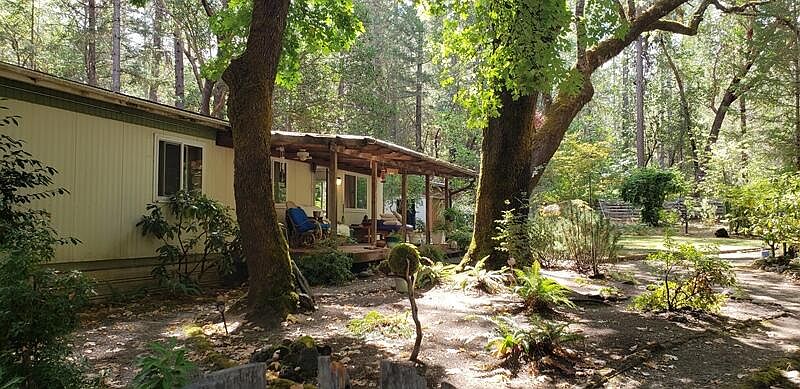 Wooded retreat! Very liveable older manufactured home with 3 bedrooms and 2 baths on 2 private acres. Walk through the gate to a truly peaceful setting in the trees. Beautiful water feature and pond create a serene place to relax. Covered front deck to enjoy the outdoors no matter what the weather is. There's a seasonal creek that runs along one side of the property. Large RV barn and sheds. Home has had windows updated to dual pane vinyl and there's a cozy addition with a woodstove and lots of windows. Due to the age of the manufactured home this will most likely need a cash buyer or private money loan.