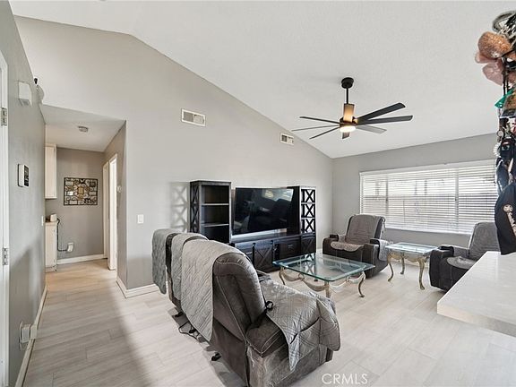 Charming Cul-de-Sac Home with Spacious Backyard and Modern Upgrades! Nestled at the end of a quiet cul-de-sac, this charming home welcomes you with a bright interior featuring vaulted ceilings and light vinyl plank flooring that flow seamlessly throughout the open floorplan. Go into the formal living room anchored by a cozy fireplace with tile surround, perfect for relaxing evenings. The heart of the home is the open-concept family room, dining area, and kitchen, creating a wonderful space for gatherings. The kitchen boasts white cabinetry, stainless steel appliances, and elegant quartz countertops for a modern touch. Sliding doors from the dining area lead to the backyard oasis with a large covered patio featuring a ceiling fan—ideal for outdoor dining or relaxing in the shade. The grassy yard provides plenty of space to play, entertain, or garden, complete with a firepit and a storage shed for added convenience. A hallway leads to three comfortable bedrooms, two bathrooms, and a laundry room with direct access to the garage. The primary bedroom is complete with a walk-in closet and a private en suite bathroom. The home had the exterior repainted last year with Tex-Cote Coolwall paint that increases energy efficiency, fire protection and includes a lifetime warranty. Conveniently located close to schools, the 79 freeway, markets, and dining options, this home offers both comfort and convenience. Don’t miss your opportunity to own this beautiful, move-in-ready property!