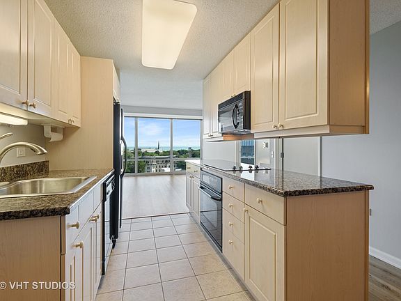 Absolutely gorgeous east views of the lake and skyline from this freshly renovated, highly desirable '05' tier. Just completed installation of Swedish 5" plank white oak wood floors and has been freshly painted top to bottom. Enjoy a good morning sunrise and coffee from your private balcony. Granite kitchen with maple cabinets & brand new cook-top. Unit features split 2 bedrooms, 2 baths, a nice-sized dining area and a bonus den with open shelves for an office or study space. in-unit laundry too! Full amenity building in downtown location with door person, pool, fitness center, sundeck, grills, party room, and garage parking #93. There is a floor plan and a video walking tour of the interior if you prefer to look virtually. Monthly assessment includes most everything: heat, AC, water, cable/internet & garage. Additional private storage locker #73