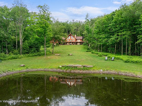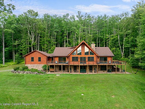 Nestled in the picturesque town of Andes, this custom-built log home is a true sanctuary, offering 5680 total sq ft of luxurious living space (including the finished lower walkout level with 2320 sq ft of entertaining and living space). Built in 2010, this exquisite property boasts a private setting with stunning mountain views, making it a must-see for those seeking serenity and natural beauty. The expansive outdoor space is an entertainer's dream, featuring a BBQ area with a wood-burning fireplace, relaxing hot tub and a tranquil pond. The wrap-around decks provide ample space for lounging and enjoying dramatic sunsets over the mountain. Step inside to discover a home designed with both elegance and functionality in mind. The gourmet kitchen is a chef's paradise with a complement of high-end appliances. The walk-in pantry ensures you have plenty of storage space, while the island with seating for six makes it easy to entertain guests or enjoy casual dinners. The home also boasts on-demand hot water, radiant floor heating, floor-to-ceiling windows and skylights for abundant natural light. These modern conveniences ensure comfort year-round. The living room and primary bedroom share a cozy two-sided fireplace, adding a touch of warmth and elegance. The additional rooms in the home provide ample space for work and play, including an office where you can focus on projects or work from home, an open loft that can be used as a reading nook or additional living space, a huge family room perfect for movie and game nights, and a gym where you can maintain your fitness routine without leaving the house. Embrace all that the Catskill Mountains have to offer with farm-to-table restaurants, quaint hamlets and villages, world-class fishing, hiking and skiing all within reach. This property is not just a home; it's a lifestyle.
