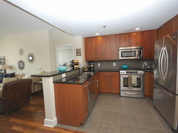 With the light rail at your door this home is a commuter's dream. Featuring 9'6" ceilings, oversized windows, a terrace & an Eastern exposure this bright and airy home offers Walnut flrs, a kitchen with Cherry shaker cabinets, granite counters w/Italian Ceramic backsplash. The bath boasts Maple cabinetry w/marble vanity, limestone flrs & Italian porcelain wall tiles. Amenities incld a common roof deck, fitness center, community room, & cyberdoorman w/ package delivery room. Indoor parking available in the building for an additional $250/mnth. Available immediately. Home has been freshly painted. Pets considered with owner's approval.