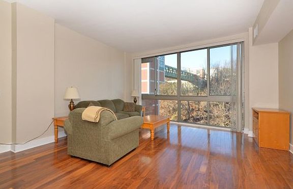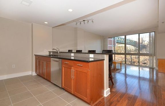 This Over sized 1 bed apartment boasts massive Floor to Ceiling windows for tons of light, gleaming hardwood floors, designer kitchen w/granite counter tops, s/s appliances and custom built-ins. Condo features upgraded bath w/custom tiling. Building offers virtual doorman, fitness center, community room and roof deck with NYC views! Located at 9th Street Light Rail Stop. Parking included!