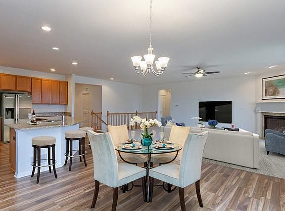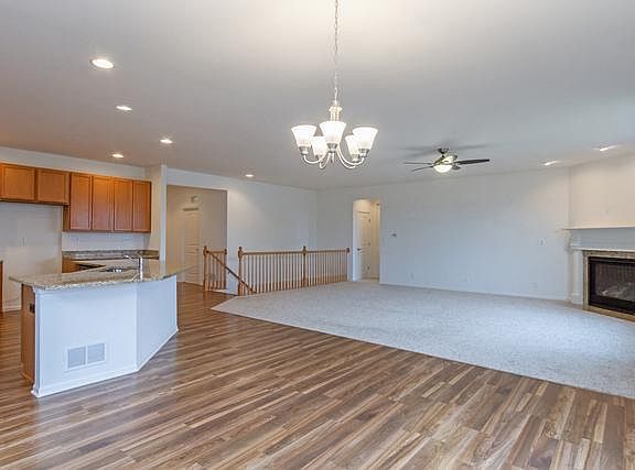 Make yourself at home in this beautiful, move in ready, 3bed room Ranch. This Conventry Model expands the Living Room/Dining room combo and basement by 4'! Step inside to the open concept floor plan featuring elegant 9' ceilings, drawn out living room and kitchen with gorgeous granite counters and large breakfast bar. Composoite 10x10 Trex Deck featured off of Dining room. Elegant Master Suite includes spacious full bath and custom walk in closet. Extend your space by adding your personal touch to the convenietly framed lookout basement and roughed in bath. Garage also has a 4' extension on the south side for additional storage!! The home sits on a large lush lot in the desirable Hampshire Highlands. 10 minutes from parks and the Hampshire Forest Preserve, also located just 40 minutes from O'Hare airport.