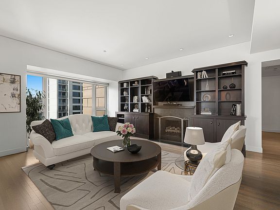 Elegant fireplaceSecond en-suite bedroomBuilt-in entertainment centerLarge islandExpansive floor-to-ceiling windowsLuxurious primary suiteRich hardwood flooring