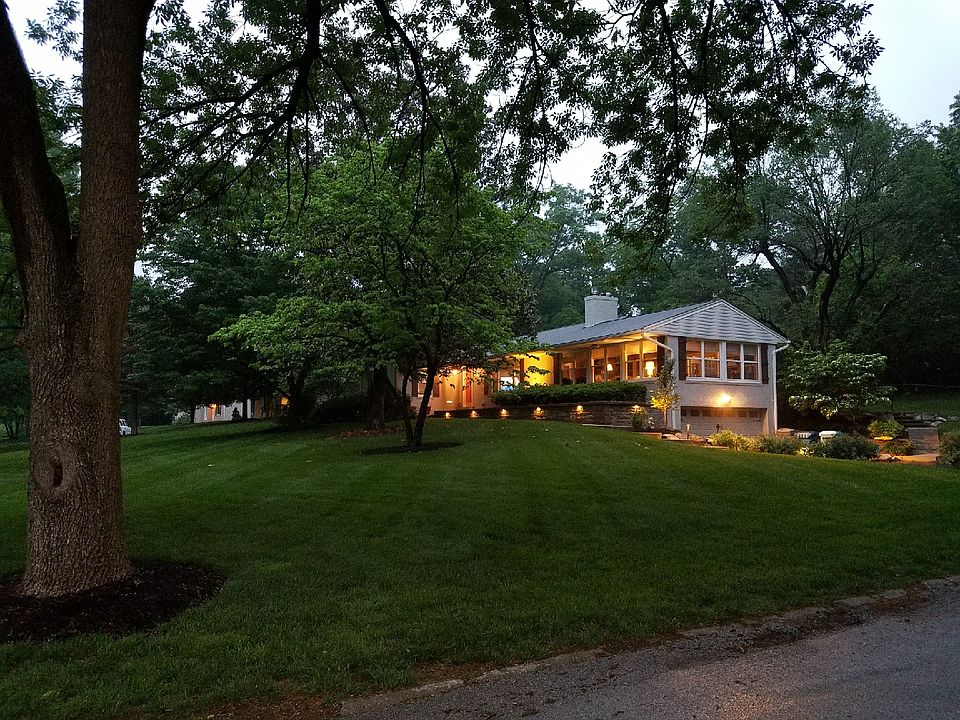 Gorgeous freshly painted; 3bd 3ba brick ranch on 0.52 ac private park-like ground; Side-entry 2 car gar tucked in bsmnt; Newly re-finished hrd wd floors (2015) in LR, DR and 3 bdrms; Open flr plan; LR w/wood burning FP, opens to family room w/lots of windows and new carpet (2015); House is full of natural light; Formal DR; Eat-in kitchen with 42 in white cabinets, granite counters (2012-2013) newer appliances and 1 gas furnace (2014 - 2015). Thermal windows and 6 panel white doors; Recent improvements include: roof/15x20 Four Season sun room/freshly painted interior; 20x12 Master bdrm addition plus a 14x12 vaulted master bath featuring tile floors, his and hers vanity, separate shower and Whirlpool tub; Partially finished lower level with rec room, full bath, laundry area and ample storage and door to garage; AHS home warranty provided; Minutes to highway 270, 40 and Lindbergh, major hospitals, shopping and restaurants. 2532 sf per appraisal report incl. the sun room. Sun Room is the Den.