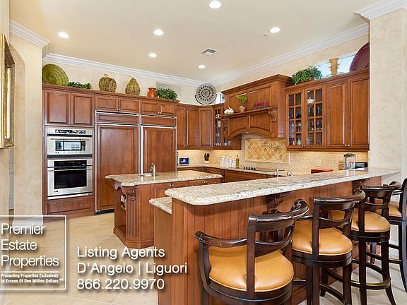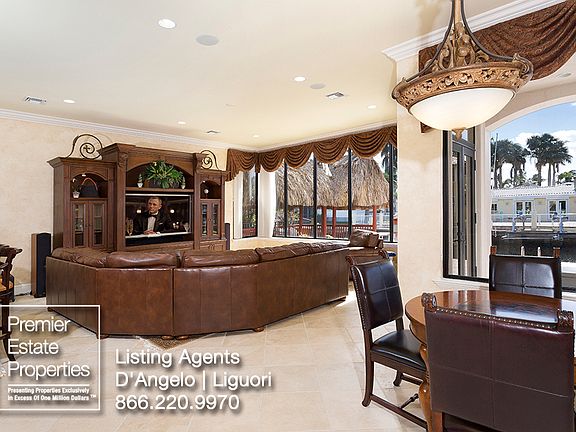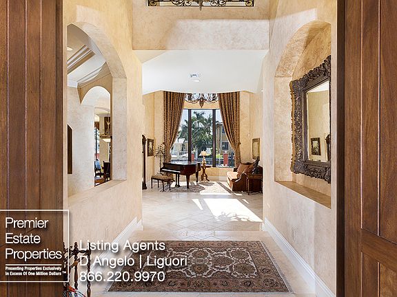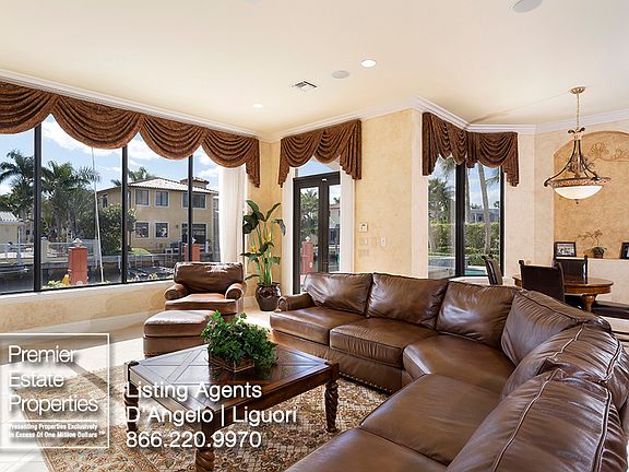 Impeccably maintained elegant 2 story waterfront home fronting 80 feet on the tranquil waters of Boca Harbour. Making a dramatic introduction to the five-bedroom residence, the soaring foyer views the waterfront through the sunlit window wall of the two story living room, the centerpiece of the open layout. On either side of the living room, the large light-infused family room and library/office open their doors to the waterfront's fabulous night-lit entertainment space where, next to the infinity pool, the exotic tiki hut provides a delightful spot for outdoor dining and drinks. Large upstairs master suite has its own yoga room/gym. All bedrooms have private baths. Other features include a full house generator, elevator, recently redone dock with upgraded electrical work and much more.