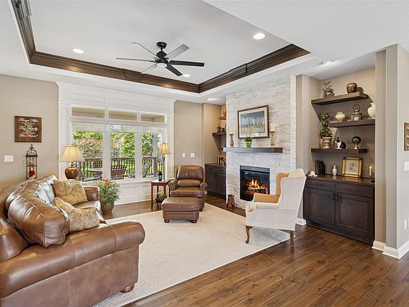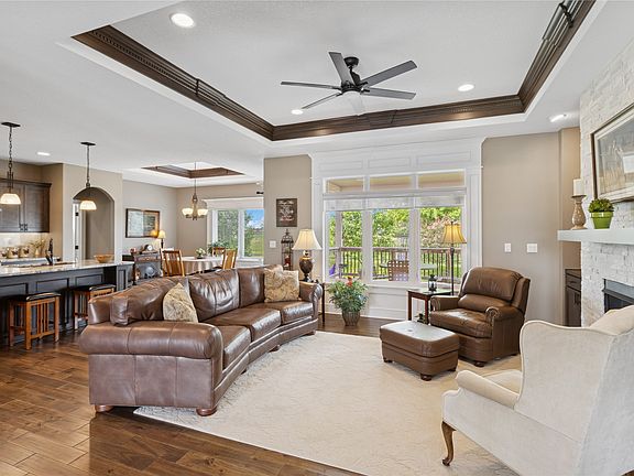 Immaculate ranch home in highly desired Fox Creek Estates. This east facing home provides beautiful sunrises from the front covered porch and beautiful sunsets from the back cedar covered deck. The carefully designed landscaping adds beauty and privacy to the home. Walking in through the front door you are greeted by arched doorways, a decorative railing staircase, gorgeous trim in the windows and tray ceilings, and a beautiful view of the landscaping. The home was built with QUALITY in mind. The rounded drywall corners, solid core doors, engineered hardwood floors, and solid wood shelving in pantry and all closets are things you don't find in most new construction homes. The kitchen boasts a gas stove with vented hood, large drawers and cabinets, pantry, undercabinet lighting, backsplash and a new refrigerator. The dining area has executive wainscoting and a tray ceiling. The great room features a gas fireplace with built in bookcases and a tray ceiling. The primary suite has an oversized tile shower and the closet has access to the laundry area. Two more bedrooms and bath round out the first floor. Moving downstairs is the wet bar with upper and lower cabinets and a full size refrigerator. The free standing island/table makes entertaining easy. Two more bedrooms and bath complete this area. Add in a 50 gallon water heater, humidifier, work bench in the garage, central vac and irrigation, this home has it all. Waukee NW feeder and walking distance to Grant Ragan Elementary.