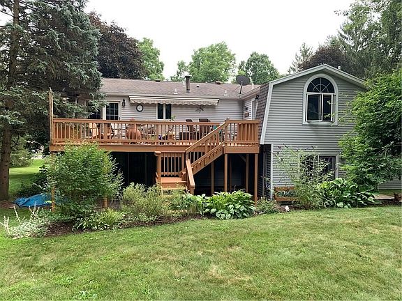 You must see this amazing property! This open floor plan home features a beautifully finished lower level, perfect for an in-law suite with private entrance and walkout patio overlooking a 1.4 acre wooded setting. The kitchen features beautiful cabinets, updated appliances and french doors out to a large deck. The large family room boasts a propane fireplace. Stunning master bedroom suite features a master bath with cathedral pine ceiling , duel sinks, jacuzzi tub and stand alone shower with private deck access. Imagine enjoying the sunrise and your coffee while watching the wildlife in your own backyard. New roof (2019) on the garage with ample storage above. Enjoy the quiet privacy of this lot while still being close to everything! Honeoye Falls Lima Schools