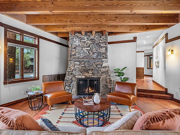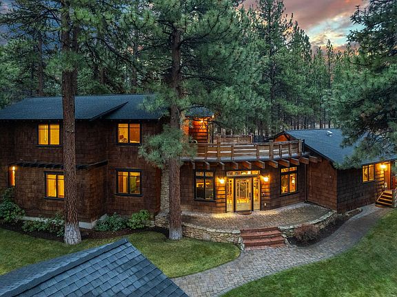 A unique masterpiece inspired by the Pratt House on the Casa Barranca estate in Ojai, CA. This home showcases meticulous craftsmanship w/ post & beam construction, maple flooring, a stone wood-burning fireplace, & expansive windows framing views of the Forest. A true chef's kitchen boasts professional-grade appliances & an impressive island w/ a prep sink, complemented by a spacious dining area for entertaining. The main level includes an ensuite & an additional bedroom & bath. Upstairs, a private master suite awaits, offering forested views & a private roof deck. The beautiful primary bath features travertine floors, a generous walk-in shower, tile tub, & a spacious walk-in closet. Enjoy summer evenings in a private Central Oregon setting on half an acre surrounded by ponderosa pines. Two detached 2-car garages provide ample storage for cars & toys. This one-of-a-kind home is conveniently located near the brewery, movie theater, & other amenities, including 5 Pine Lodge.