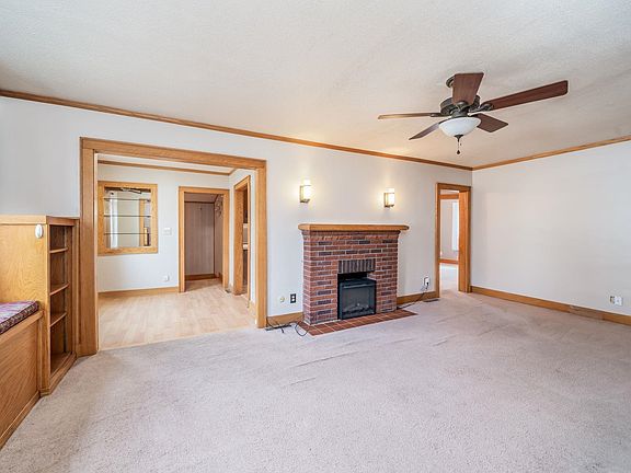 Adorable home with custom built-in carpentry and beautiful wood trim throughout. Easy-clean windows were installed in 2020 and have a transferable warranty. The living room features a decorative fireplace with electric insert, fresh paint and built-in bookshelves with window bench. The kitchen and formal dining room have also been freshly painted. All appliance remain, including the washer and dryer. The main floor is completed with a full bathroom and two bedrooms. Custom wood-work in the master bedroom includes built-in night stands, shelving and dresser-like drawers. The basement features a large family room, laundry room and extra storage space. Outdoor amenities include a large, covered front porch, storage shed, and a large backyard with a smaller fenced-in area. There is also what appears to be an old underground storm shelter just south of the driveway. Seller is offering $1,500 flooring allowance. Water heater, stove, washer and dryer are all about 6 years old. Furnace and A/C are routinely maintained.