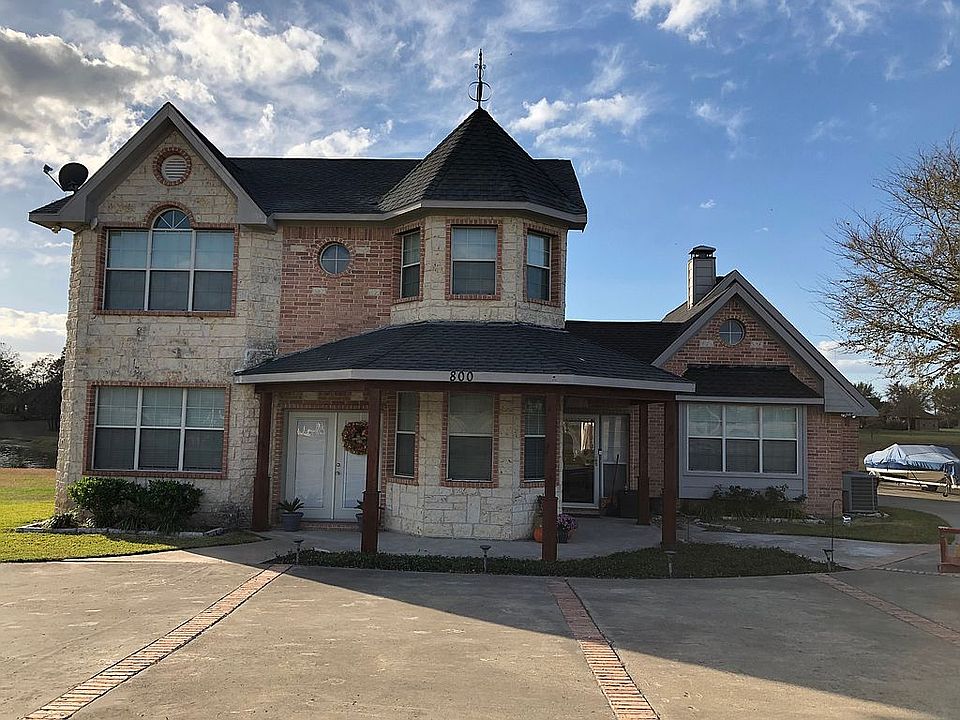 STUNNING VIEWS OF THE LAKE AND IT IS SURE TO CATCH YOUR EYE!! This spacious home was built with upscale hand tumbled brick, 4 bdrm, 3.5 bath has 2 staircases, one leads to the bedrooms and the other leads to the A-frame media room, ceramic tile in kitchen, laundry room & bathrooms, carpet in the upstairs bedrooms and hardwood floors living room, stairs, 2 offices and A-frame media room, master bedroom has hard wood floors & master bath has tile floors, separate shower, jetted tub, double vanity and is on the main floor, half bath on main floor, the upstairs bedrooms have new carpet,