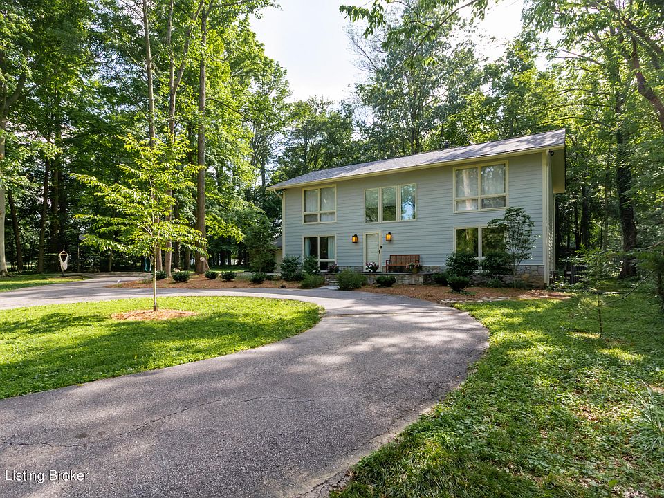 Located in the desirable Anchorage School District, this home offers an impactful first impression with the lengthy front yard and circular drive in a park like setting. Situated among mature trees and just over an acre within Louisville's most idyllic neighborhood, Anchorage. This unique home has a traditional floor plan, yet has a mid-century modern feel to it. The main floor of this home is filled with large rooms, multiple living spaces and great flow with an open floorplan. Loads of full-length windows offer so much natural light at all facets inside the home. The galley like kitchen has a new gas stove and oven, a plentiful amount of cabinetry, stainless steel appliances and conveniently transitions into the breakfast nook and one of the two inviting family rooms. Off one of the family rooms is an office area for easy work life at home. The custom staircase leads upstairs where there are four large bedrooms. The Primary Bedroom offers two large closets and a full en-suite bath with a tiled shower. The lower level of the home has a family room that has new luxury vinyl hardwood like flooring and is a great space for a playroom, gym or theatre. Outdoors, the newly added deck is the perfect place to enjoy summer nights in this park like backyard. The views are spectacular and adjoins to the Anchorage Pony Trail where you will be entertained by the frequent horseback riders. Many updates have been made to this home that include all new exterior to the garage, a new garage roof, leaf filter guards, new lighting, paint, a new hot water heater, new full length glass doors that lead to the back porch and backyard. Other features of this home are the newer roof (2016), newer HVAC unit (2018 and 2019), newer whole house generator, landscaping and decking. Anchorage has small-town charm through its active community of neighbors, vibrant traditions and historic architecture. It's a friendly place where city employees, police and residents know each other by name. Anchorage is well-known for its exceptional, Award-winning K-8 public school and its scenic beauty with tree-shaded parks, horse paths and walking trails throughout the city.