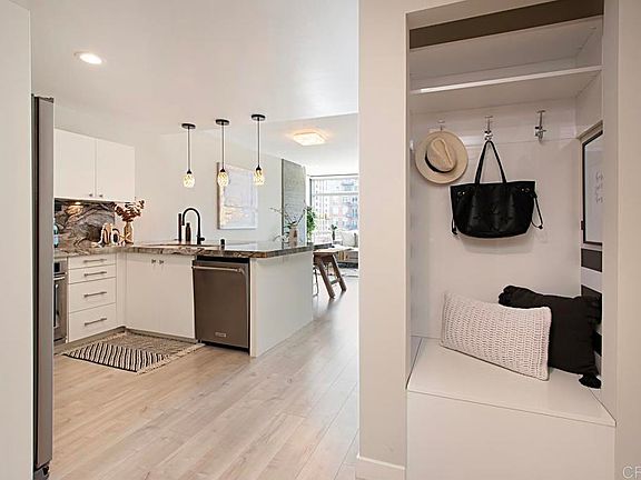 Experience luxe living at its finest in this stunning one bedroom condo located at the iconic Mark residence! This modern, move-in ready unit, boasts floor to ceiling glass windows that offer breathtaking cityscape views and overlooks the pool/spa and wonderful community grounds. The open layout is enhanced by beautiful planked floors and abundant natural light, creating a warm and inviting atmosphere. The chefs kitchen is a true highlight, featuring a sleek oversized quartzite countertop, spacious seating at the eat in kitchen, and separate dining area. Step out onto the spacious balcony to enjoy the fresh air and city views, while enjoying the sights and sounds from Petco Park! The unit also includes convenient in-unit laundry and a generous dedicated storage space next to reserved parking space. Residence of The Mark enjoy world class amenities, including 24-hour security and concierge services, a sparkling pool/spa, fitness center, newly renovated BBQ and communal areas with fire pits to gather and relax amidst the vibrant downtown scene. Dont miss this opportunity to live in a prime location with everything San Diego has to offer right at your doorstep!