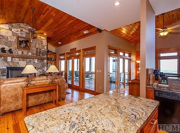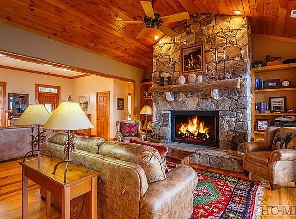 This meticulous move-in ready custom home has an outstanding location on Toxaway Mountain and exceptional views of Lake Toxaway, the Blue Ridge Parkway, Looking Glass Rock and many other notable landmarks. This home features two large stone fireplaces, wood floors, 3 BR on the main floor, open plan and granite counter tops. Spacious lower level for guests with large bar and area for pool table. Large covered back porch with knock-out views, fenced yard and almost level driveway with plenty of room for parking.