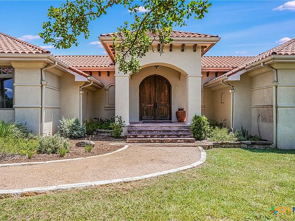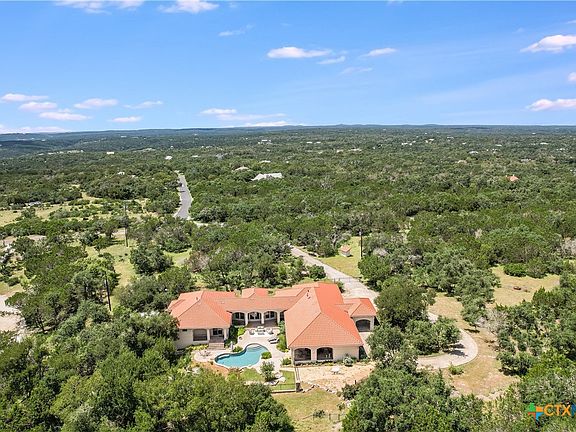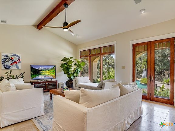Welcome to a stunning Mediterranean retreat nestled in the Hill Country. This custom-built home offers luxury, comfort, and breathtaking views at every turn. As you enter through grand double doors, the foyer greets you w/dramatic views of your private backyard oasis, complete w/sparkling pool that beckons for a refreshing dip. The home’s exquisite design is evident as you pass the cozy library, adorned with a wall of custom built-ins. Travertine floors stretch throughout most of the home, adding elegance and warmth. The heart of this home is the true chef’s kitchen, an entertainer’s dream. Equipped with a Thermador 6-burner range, Sub-Zero refrigerator, and expansive center island, this kitchen is designed for function and style. The open floor plan seamlessly connects the kitchen, dining room, and living room, all offering stunning views of the pool. The home’s layout wraps around this central outdoor space, creating a harmonious flow between indoor and outdoor living. On one side of the home, you find 2 bedrooms, sharing a bath. The other side of the home hosts 2 secondary bedrooms and a bath, along w/a versatile craft room that connects to the laundry area. The primary suite is a true sanctuary, featuring a sitting area w/ picturesque views of the pool, a walk-in closet, an a luxurious bath. The ensuite bath is equipped with built-in cabinetry, a double vanity, a soaking tub, and a separate shower, providing a spa-like experience at home. This property is not only beautiful but also practical, wi/a rainwater collection system, well, an a oversized garage w/a car charging station. Additional features include a portico for extra covered parking. Located just a short drive from the River Mountain Ranch private water park, this home offers exclusive access to the pristine Blanco River, where you can enjoy the natural beauty and tranquility of the Hill Country. This custom Mediterranean home is more than just a residence—it's a lifestyle.