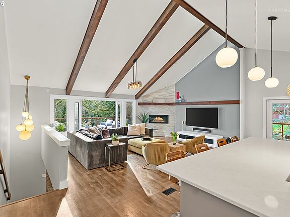 Step into luxury and style with this stunning mid-century modern home, nestled in Forest Highlands. This is a designer's home that has been thoughtfully renovated in 2017, featuring an array of modern amenities and elegant touches throughout. The freshly remodeled gourmet kitchen presents stainless steel appliances, quartz countertops and open-concept access to a spacious family room. High vaulted ceilings with exposed beams create an open airy ambiance, and the gas fireplace offers warmth and charm to the gathering space. The main level living features three full bedrooms and two full baths, including a spacious primary suite with a walk in closet. In 2018 the "Cheeky Lounge" was designed to enjoy the outdoors 365 days a year! This amazing outdoor extended living was created, complete with vaulted cedar ceilings, commercial grade heat lamps, dual fans and custom automated shades. The bar and grill were designed for the space with venting system and built in ice maker. Gather with friends and family around the fire pit and enjoy the backdrop of serene wooded views. Enjoy the flexibility of the lower level separate living quarters with exterior access for extended guests or a rental option. The second primary suite includes a full bath, spacious walk in closet and direct access to the laundry room. In the daylight additional living space you will discover a cozy, elegant living room with gas fireplace and access out to a private covered deck. This home is perfectly positioned within walking distance to the vibrant downtown Lake Oswego, indulge in top restaurants, local boutiques, and the farmers market. Reap the benefits of top rated schools in the state. Enjoy the PNW experience with two trail heads to Tyron State Park right out your front door! You will love this idyllic retreat that combines modern living with nature's tranquility.