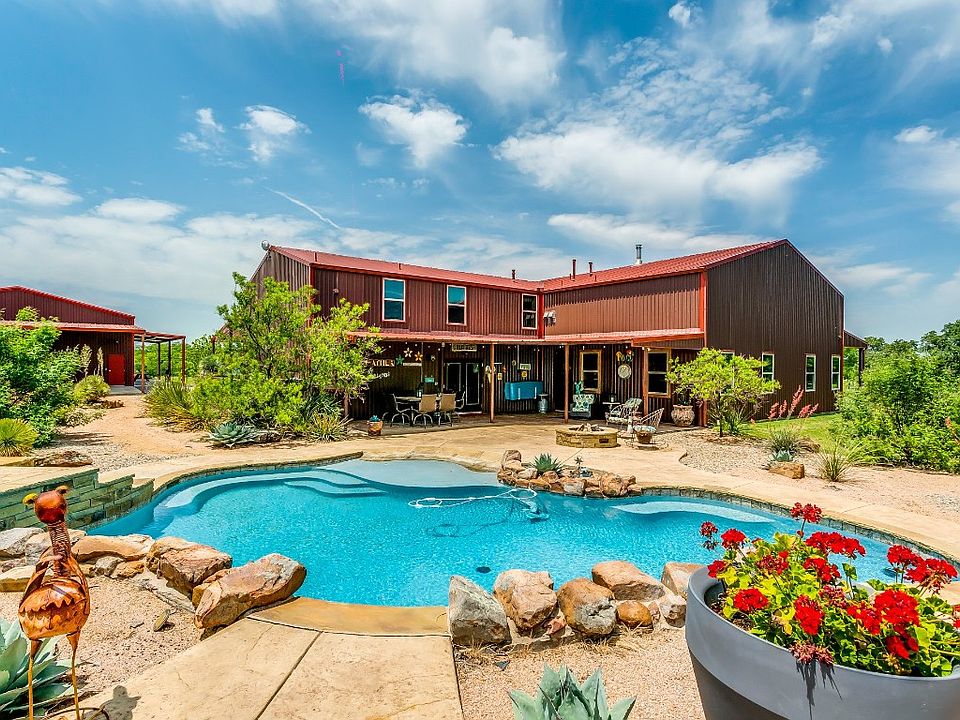 Resort style home on 110 acres with amazing Oak trees and 4 tanks!6 bed 3 bath Barndominium features 2 full kitchens ,outdoor kitchen, pool, hot tub, wrap around covered porches with 2 entertaining ares, large shop, 2 water wells and tons of road frontage with 3 entrances from main road! The home has 2 separate entry doors and can actually be 2 completely separate homes under one roof connecting through hallway with office and mudroom! One side features eat in kitchen with butlers pantry,living area and fire place, master suite and bath, guest room and bath and laundry.The other side features 4 beds and and bath upstairs, large chefs kitchen, glass refrigerator , living area and 2 dining spaces. Chefs kitchen opens to pool area with fire pit, 2 covered entertaining patios and out onto the outdoor kitchen with built in grill, Egg and sink!The 2,400 sq ft shop with 3 phase electric ,spray foam insulation ,full bath,2 automatic 12 ft doors, covered parking can be used for RV-trailer.