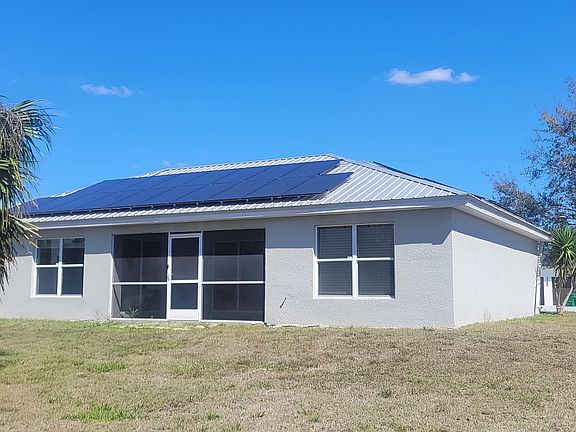 This gorgeous 3/2/2 corner home has too many amenities too list FIXED ELECTRICAL BILL WITH SOLAR PANELS up to 1200 Kw x month $117 + Fpl bill aprox $30 NO SURPRISE BILL . FIXED 3% increase x year 2 Bedrooms with enclosed ceiling fans, ample closets very light and airy 1 main master suite with his /hers closets Enclosed ceiling fan Shower and bathtub in main bath Double sink with vanities Private screened patio with fan Washer / Dryer in unit and large pantry Excelent appliances Lots of storage Freshly painte Metal roof Quiet street Large 2 car garage All appliances maintained by landlord Stable ownership 1st and deposit at signing Last w/ 2nd and 3rd month Electronic application 1 year Renewable x year Electricity bill to increase only 3% fix x year