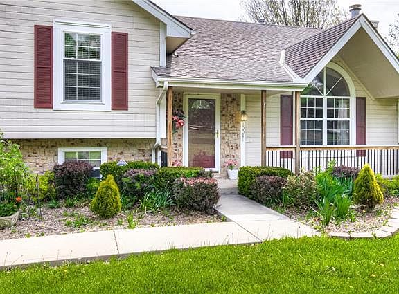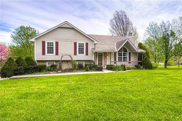 Come home to a beautiful setting with land to call your home. Let your critters on 2 or 4 legs roam on the beautiful 3.8 acres. Well appointed kitchen with island and lots of natural lighting. Plenty of plants and trees to let the gardener in you flourish.Lawson address and Lathrop schools