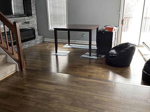 Step inside to find a freshly painted interior, highlighted by brand-new hardwood floors throughout the main level, recessed lighting, and smart lighting. The living room is a showstopper, featuring a custom stone wall complete with an LED fireplace, setting the scene for cozy evenings or casual entertaining. The fully remodeled kitchen boasts modern finishes, offering both function and elegance, while recessed lighting throughout enhances the home's warm ambiance.