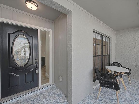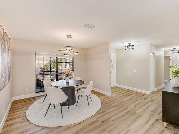 Welcome to this tastefully renovated pool home tucked away on a quiet cul-de-sac, where comfort and style meet everyday living. Featuring 4 bedrooms plus an office, 2.5 bathrooms, and an oversized 2-car garage, this property has been thoughtfully updated inside and out, creating a move-in ready retreat. Fresh landscaping and a charming mosaic-tiled front porch set the stage as you step inside to discover a home designed for both relaxation and entertaining. The moment you walk through the door, you’re greeted by a sense of openness, thanks to the split floor plan, vaulted ceilings, and luxury vinyl flooring that flows seamlessly throughout. Warm, neutral tones paired with matte black finishes and modern single-panel doors create an inviting ambiance. At the center of the home, the fully renovated kitchen stands as a showpiece, with sleek stainless steel appliances, two tone custom cabinetry, and a large island featuring a quartz waterfall design on both sides. It’s a perfect space to prepare meals, sip morning coffee, or gather with friends while overlooking the cozy stone fireplace in the living room and the sparkling pool just beyond. To the left of the entry, the guest wing offers three spacious bedrooms, a stylishly updated bathroom, and an additional room ideal for a home office, playroom, or guest space with direct access to the pool deck. On the opposite side, the primary suite feels like a private retreat, boasting vaulted ceilings, a walk-in closet, a linen closet, and a spa-inspired bathroom with a double vanity and a tub/shower combo surrounded by floor-to-ceiling tile. Just off the main living area, you’ll also find a convenient half bath for guests, a large laundry room with sink, and direct garage access. Step outside and experience Florida living at its finest. The resurfaced and newly tiled pool sits beneath a screened enclosure, surrounded by a spacious refinished pool deck with stamped concrete that elevates the outdoor living experience. Whether you’re hosting weekend barbecues, enjoying cocktails with friends, or simply lounging in the shade of the covered patio, this outdoor space was designed for both relaxation and entertaining. The lush backyard with vinyl fencing and a storage shed completes the retreat-like setting. Recent upgrades provide peace of mind, including a new roof (2021), high-end HVAC system (2022), water heater (2023), and updated electrical panel. Inside and out, this home has been carefully curated with style and functionality in mind, offering a perfect blend of modern luxury and everyday comfort. Don’t miss your chance to call this stunning cul-de-sac property your own—schedule a private tour today and imagine the lifestyle awaiting you.