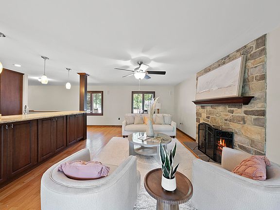 Fantastic opportunity in Dutchman Downs! Amazing ranch plan with full basement on flat usable 1.2 acre lot, plenty of room to roam, since purchasing the home has been extensively renovated, floors, kitchen, baths, basement, open and bright floor plan, gorgeous hardwoods, entertainers' delight kitchen, custom cabinets and generous counterspace, stainless steel appliances, granite, island, dining area, large family room with fireplace, office, spacious owner suite, step in shower, dual sinks, walk in closet, 2 additional bedrooms, bath, finished basement offers versatile space featuring wet bar, large recreational space perfect for a game room or theatre, additional bedroom and full bath, ample unfinished storage, step out onto the patio and take in the private backyard, grilling deck, invisible fence, fiber internet available in the neighborhood, heated 3 car oversized garage and workshop with ample shelving for tools. Low HOA fees, convenient location close to shopping, restaurants.