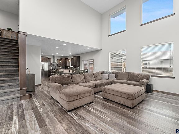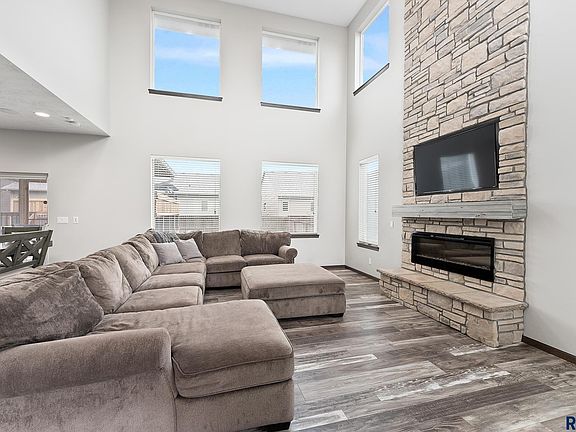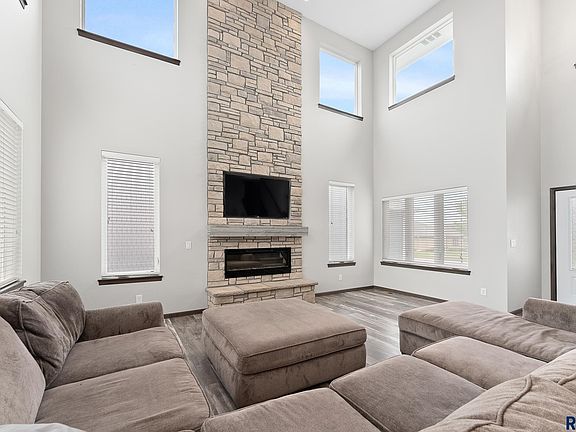 This stunning 2 story is an entertainers dream home! The kitchen is overflowing with cabinets, spacious center island, abundance of quartz counters, high-end appliances thru out including gas range, tile backsplash & large pantry. Open concept design from the kitchen into the spacious dining & living room with 19ft ceiling with a beautiful stacked stone fireplace from floor to ceiling & fantastic window display. The primary suite has vaulted ceiling, double vanity & huge WIC. Upper level hosts 2 more beds, full guest bath & laundry. Basement is finished with wet bar, living area, and one bed & full bath! Backyard is where you will find a covered deck that leads to an above ground heated pool with the deck around it, separate cabana area, landscaping, outdoor grilling area & enough yard space for all your needs. Finished & functional oversized heated 3 stall garage with epoxy floors and surround sound throughout the home. Seller is licensed realtor in the state of SD.