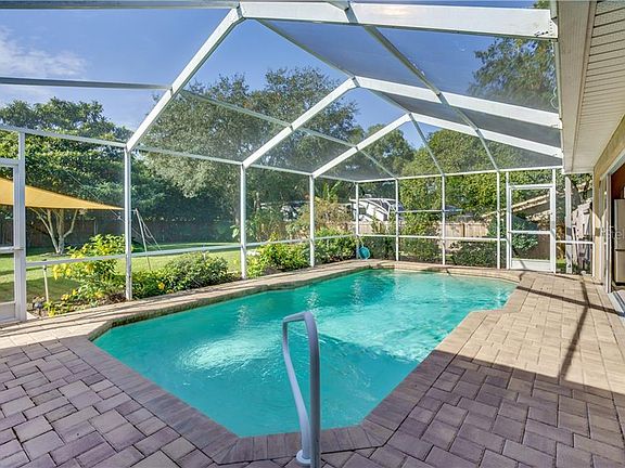 Contact the Official Listing Agent Tracie Maler. This beautifully maintained 3-bedroom pool home on a corner lot has just what you're looking for! Double door entry to an open and bright living space with vaulted ceilings, gorgeous tile floors, triple sliding glass doors which present an amazing view of the pool and lanai. Kitchen features newer stainless appliances, wood cabinets with pull-outs, granite counters, laminate wood flooring and a breakfast nook with views of the pool. A 3-way split-floor plan provides privacy all around. The master suite offers ample storage with two good-sized walk-in closets, sliding glass doors to the pool. The master bath has a zero-entry walk-in shower, linen closet, water closet and dual sinks. A family room separates the other two bedrooms. One guest room has easy access to the pool as well as the full guest bath. Laundry room includes a full wall pantry and shelves for storage. The backyard is a private oasis! Screened pool and lanai with 2 ceiling fans. Pool pump 2018. A delightful shaded paver patio and pergola and 10X20 shed is perfect for your workshop and hobbies. Fully fenced yard with 2 utility gates, and hidden outdoor storage. Use the private road, which is shared by you and one neighbor, to enter the side fence gate and 2 car over-sized garage with utility sink. Alarm. Recently painted inside & out. Fans and outside lights controlled by alexa. Just a short distance to the tennis courts, a fishing pier and a park.