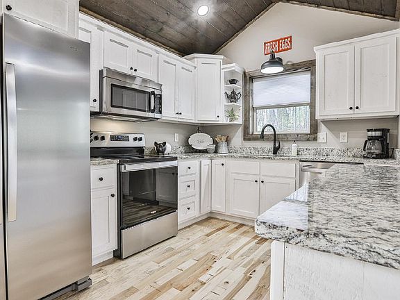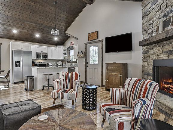 This adorable cabin is as crisp as the North Ga Mountain air! Walk right in to this fully furnished new cabin. Vaulted ceilings and open floor plan with granite counters, island, SS appliances and dining area. Great combination of sheet rock and wood, barn door, rustic and modern elements. Beautiful stacked rock fireplace is the focal point of the family room. King sized master bedroom with tons of natural light! Enjoy the outdoor decks and new hot tub. Set back in the woods on over 3.6 acres for privacy plus a year round stream! Perfect getaway--new and completely furnished! Equipped with a Level 2 EV charger and whole-house surge protector. Beautiful area of Mineral Bluff. Don't delay.