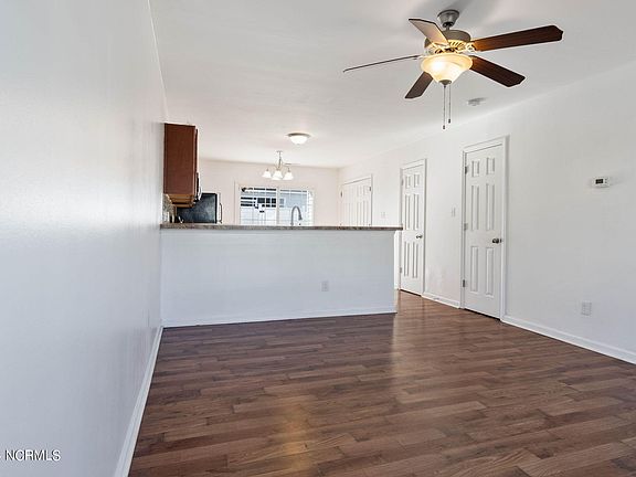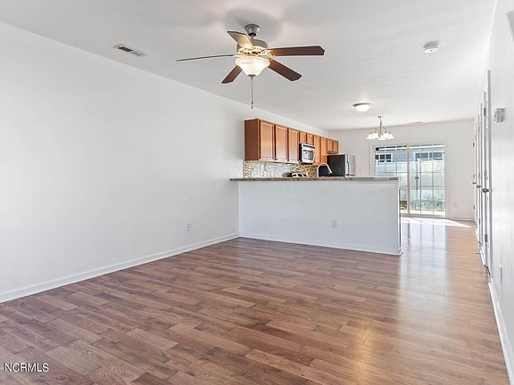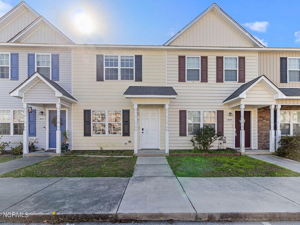 Welcome to 8007 Banister Loop, a charming two-story townhome nestled in the desirable Gables community of Jacksonville, NC. Boasting modern comforts and stylish finishes, this residence offers the perfect blend of convenience and comfort. As you step inside, you're greeted by an inviting open-concept layout on the first floor, seamlessly connecting the family room, eat-in kitchen, and dining area. The family room provides a cozy space to relax and entertain, while the adjacent eat-in kitchen features sleek stainless steel appliances, complemented by durable LVP flooring that adds both elegance and practicality. Convenience is key with a half bathroom conveniently located on the first floor, along with a discreet laundry closet for added functionality. Upstairs, discover two generously sized bedrooms, each offering ample closet space and abundant natural light. The primary bedroom boasts its own full ensuite bathroom, providing a private retreat to unwind after a long day. An additional full bathroom serves the second bedroom and guests alike, ensuring everyone's comfort and convenience. Outside, sliding glass doors lead from the kitchen to the back patio, where you can enjoy al fresco dining or simply soak up the sunshine in your own private oasis. The fenced yard provides a secure space for pets to roam or for outdoor gatherings with friends and family. Conveniently located in The Gables community, this townhome offers easy access to local amenities, schools, and major highways, making it an ideal choice for both commuters and families alike. Don't miss your chance to make this delightful property your next home sweet home. Schedule your showing today and experience the best of Jacksonville living at 8007 Banister Loop.