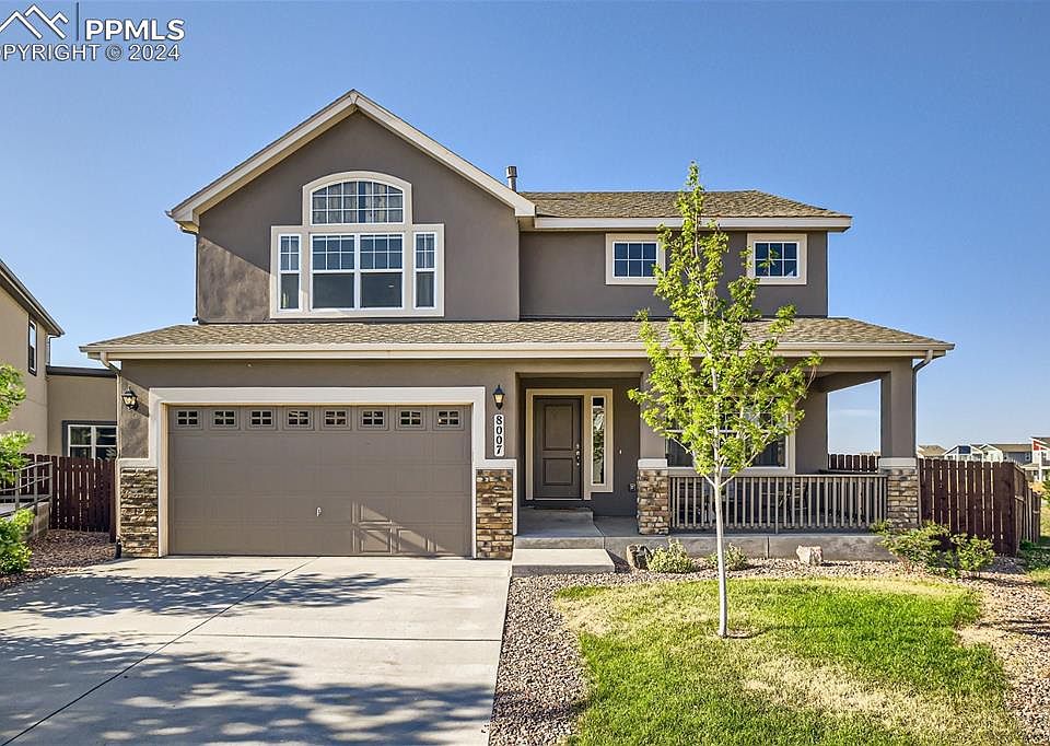 Welcome to your dream home with beautiful Front Range views in the heart of northeast Colorado Springs. This charming 2-story stone & stucco home is designed for comfortable living & seamless indoor-outdoor enjoyment. The impressive 10' x 20' front porch welcomes you to relax & unwind in style! Step inside to discover open floor plan featuring spacious great room that flows into dining & kitchen areas, perfect for both everyday living & entertaining. The kitchen is a cook's dream, boasting white Shaker cabinets, abundant granite countertops, large island & stainless steel GE appliances. Generous walk-in pantry ensures plenty of storage space. Elegant espresso oak hardwood floors run throughout the main level, adding warmth & sophistication. Adjacent to dining area, glass doors lead to deck & lower-level patio equipped with pergola & nearly new hot tub, providing fabulous private retreat with lovely mountain views. Fenced backyard & adjacent open space enhance the privacy & tranquility of this outdoor area. Upstairs, the owner's retreat is a sanctuary featuring cozy fireplace, sitting area & 5-piece bath with dual granite vanity & walk-in his-&-hers closets. Upper-level laundry room, conveniently connected to the suite, simplifies daily chores. 2 additional bedrooms & hall bath with double sinks provide ample space for family or guests. Versatile flex room with double barn door entry is ideal for second office, craft room, playroom, or any space to suit your needs. Unfinished basement offers endless possibilities for customization & expansion. A 3-car tandem garage provides ample parking & storage solutions, accommodating multiple vehicles & offering additional space for hobbies or equipment. This wonderful home is conveniently located near the Woodmen & Powers corridors with easy access to schools, shopping & dining, as well as Peterson Air Force Base & Schriever Space Force. Experience the perfect blend of luxury, comfort & convenience in this delightful residence.